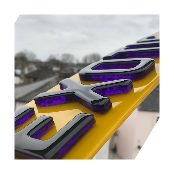 Set of premium 4D gel black neon purple 5mm replacement number plates laser cut to perfection. Manufactured using cutting edge laser technology in house, these are the latest bespoke number plates currently on trend. All characters have been designed to match the current Charles wright font. We use the highest quality letters and digits by using 3mm acrylic characters topped in jet black acrylic. As per the legality all of our plates are complaint with the DVLA standards ensuring they are MOT complaint with each plate marked with Easy Number Plates details and British Standards (BS AU 145d) markings.