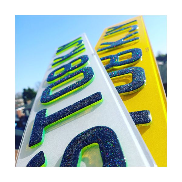 Set of premium 4D Glitter Gel Green Replacement Number Plates laser cut to perfection. Manufactured using cutting edge laser technology in house, these are the latest bespoke number plates currently on trend. All characters have been designed to match the current Charles wright font. We use the highest quality letters and digits by using 3mm Neon red characters topped in jet black acrylic. As per the legality all of our plates are complaint with the DVLA standards ensuring they are MOT complaint with each plate marked with Easy Number Plates details and British Standards (BS AU 145d) markings.