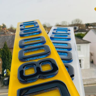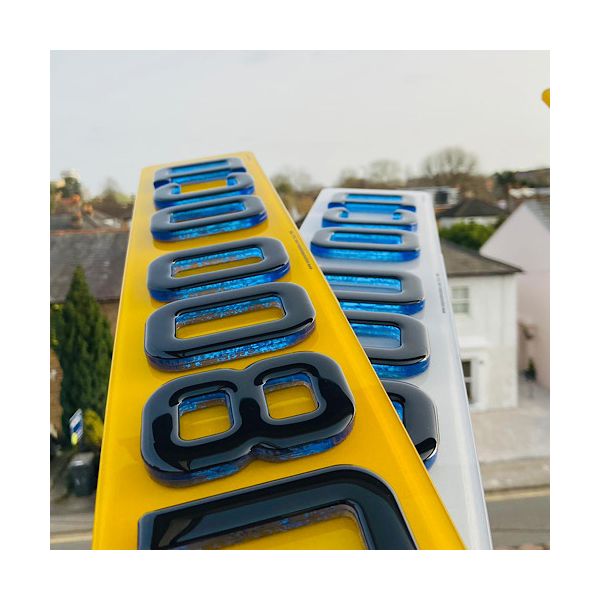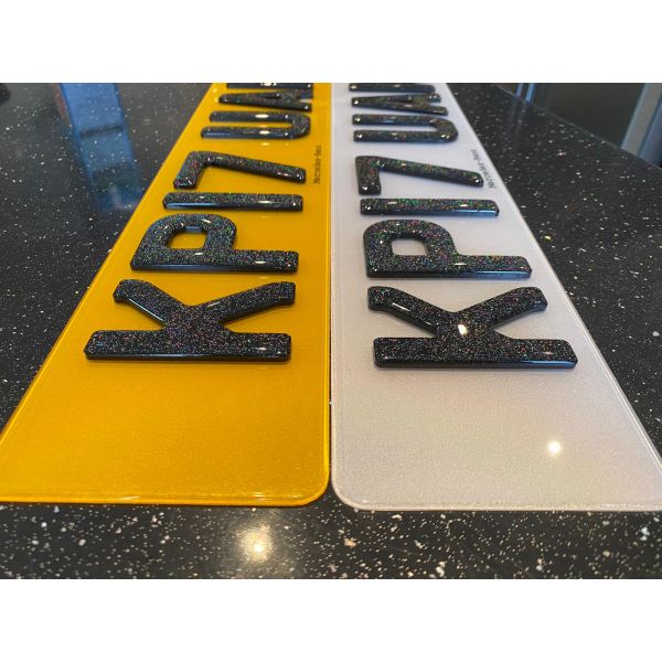 Set of premium 4D glitter gel number plates laser cut to perfection. Manufactured using cutting edge laser technology in house, these are the latest bespoke number plates currently on trend. All characters have been designed to match the current Charles wright font. We use the highest quality letters and digits by using 5mm thick glitter gel with acrylic underside for ultra slick results. As per the legality all of our plates are complaint with the DVLA standards ensuring they are MOT complaint with each plate marked with Easy Number Plates details and British Standards (BS AU 145d) markings.