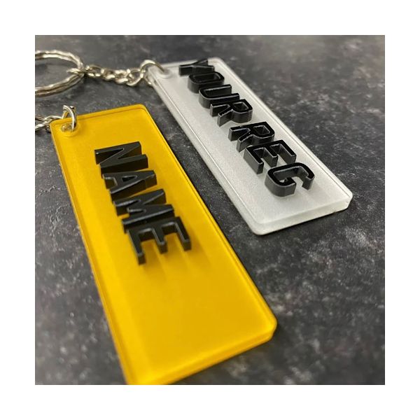 4D NUMBER PLATE KEYRING; AVAILABLE IN STANDARD OBLONG WHITE AND YELLOW ASWELL AS CHEMELELON TINT.